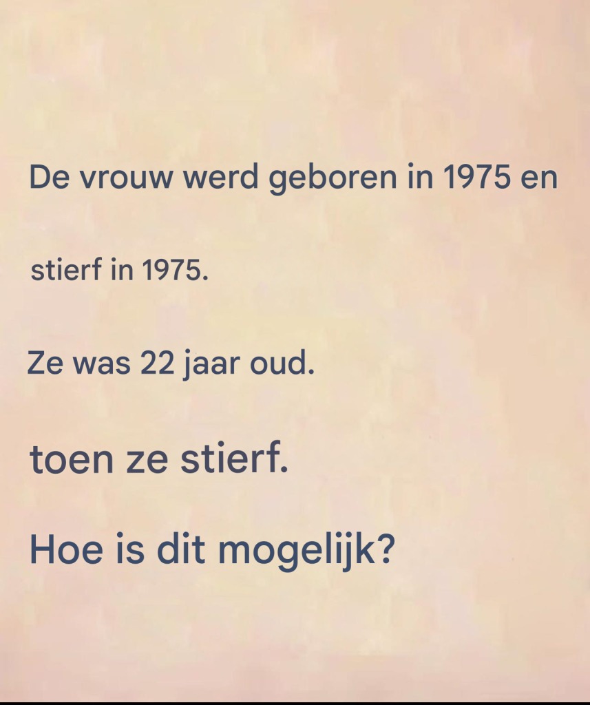 Stel je voor: als je naar nieuws kijkt, kom je deze vreemde zin tegen. “De vrouw werd geboren in 1975 en overleed in 1975. Ze was 22 jaar.’ Hij houdt je op je plaats. Onbegrijpelijk? Verontrustend? Natuurlijk, er is ergens een vangst… maar waar? Houd je stevig vast, want deze puzzel stelt onze logica, onze … Read more