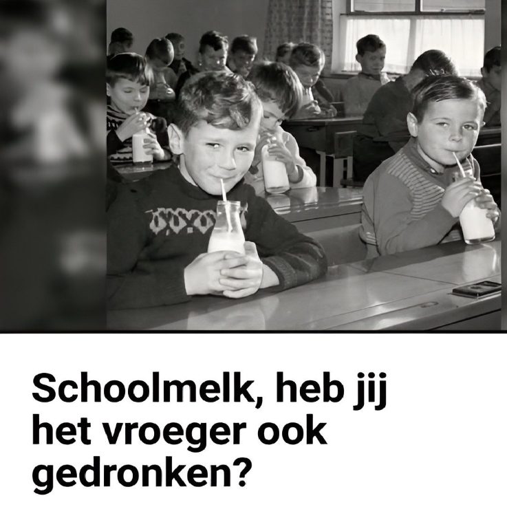 De schoolbel luidt en de kinderen haasten zich naar hun plaatsen. Het klaslokaal is gevuld met het geluid van schuivende stoelen en zacht gefluister. Op het bureau van de juf staan kratten met glazen flesjes melk, afgesloten met zilverkleurige dopjes. De geur van verse melk hangt in de lucht.
