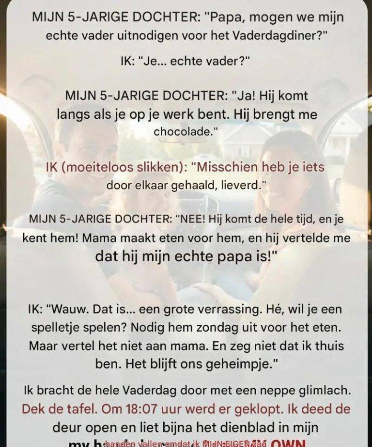 Ze sprak in fragmenten die alleen een kind kon ontcijferen – kleine momenten terwijl ik op mijn werk was, iemand die ze als « een vriendin » beschouwde, details die niet strookten met het ritme van ons huishouden. Ze begreep de zwaarte van haar woorden niet, noch de betekenis die erin verborgen zat. Ze beschreef gewoon wat ze had gezien.