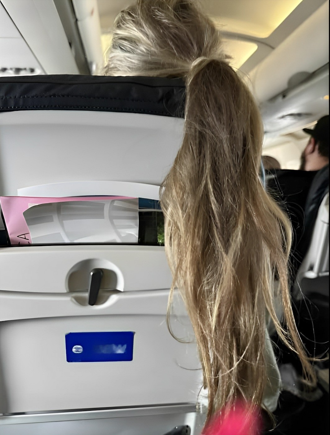 Maar zodra het vliegtuig begon te taxiën, werden mijn dromen ruw verstoord. Voor me zat een jong meisje — zo rond de twintig. Nauwelijks had ze plaatsgenomen, gooide ze haar lange, dikke haar recht over mijn tablet, waardoor het scherm bijna helemaal werd bedekt.