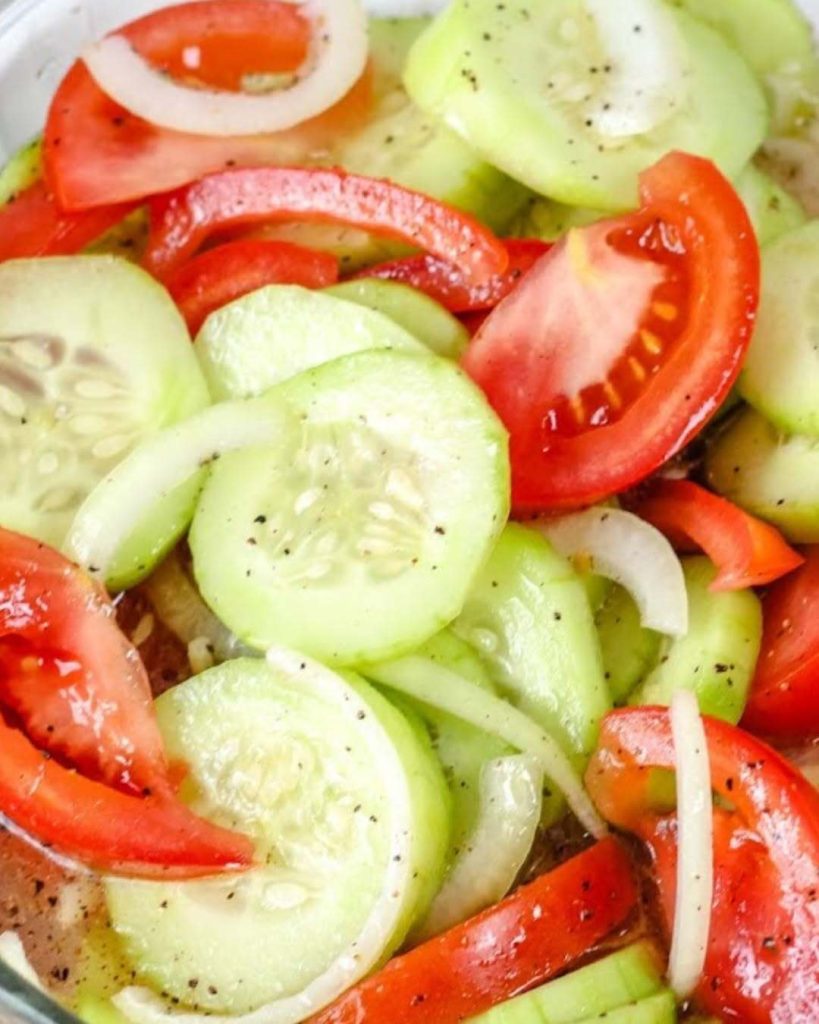 Deze salade van gemarineerde komkommers, uien en tomaten is een levendig en ongelooflijk verfrissend bijgerecht, perfect voor warm weer of als lichte bijgerecht bij elke maaltijd. Dun gesneden verse groenten worden gemarineerd in een pittige, hartige en lichtzoete marinade, waardoor de smaken prachtig samensmelten en elke hap een heerlijk verfrissende ervaring oplevert.