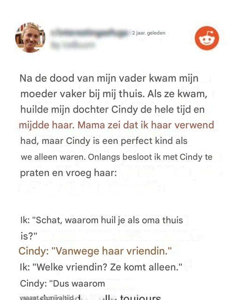 Maar onlangs, als mijn moeder Cindy afzet, huilt mijn dochter de hele tijd en vermijdt ze haar grootmoeder terwijl mijn moeder me vertelt wat ze hebben gedaan.