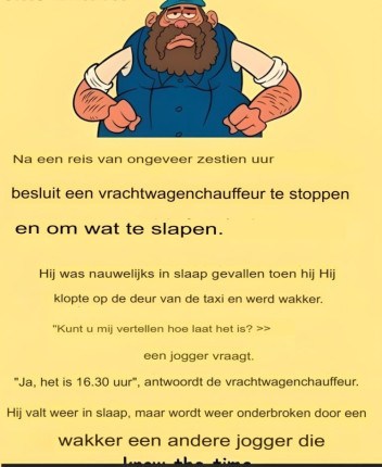 Na een korte rit van zes uur werd een lkw-bestuurder vastgemaakt, op zijn plaats gehouden en sliep. De kaum eingeschlafen zal door Klopfen tijdens de kabinetsvergadering worden uitgeworpen. « Kun je me vertellen wat er met je aan de hand is? », vraagt een jogger. « Ja, het is half vijf », antwoordde de vrachtwagenchauffeur.