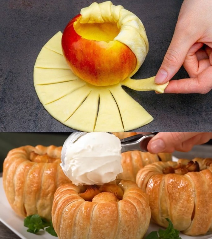 2. Snijd twee grote cirkels uit het bladerdeeg. Leg de gesneden appels in het midden van de deegcirkels. Snijd de uiteinden van het deeg in reepjes en wikkel ze om de appels, waarbij ze iets overlappen. Garneer ze met de voorbereide vulling.