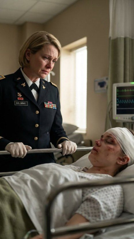 Clara was slechts een schim van haar vroegere zelf. Zijn linkeroog was gezwollen, paarsachtig, bijna gesloten. Zijn arm was verlamd in een gips, en donkere sporen, als vingerafdrukken, omringden zijn nek. Toen ik binnenkwam, staarde ze naar het plafond met die lege blik die ik bij getraumatiseerde soldaten had gezien.